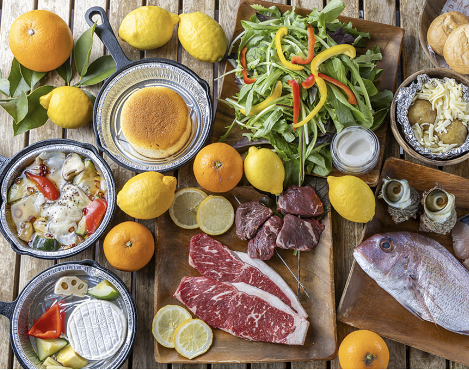 柑橘類・魚介類をはじめとした食材が豊富な瀬戸内エリア。地産地消にこだわったグランピングBBQメニューは、瀬戸内産のブランド牛「瀬戸内牛」や旬の物を楽しめる新鮮な海の幸、地元農家が作る野菜や柑橘など、瀬戸内エリアを堪能できます。また、持ち込みOKなので、地元食材を自分で調達したオリジナルBBQも楽しめます
