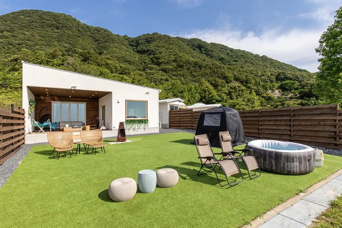 8棟全てに、広いプライベートガーデンを備えており、愛犬同伴可のお部屋ではガーデンをプライベートドッグランとしても利用できます。テントサウナが用意されているプランもあります。また、ガーデンスペースには焚き火台、無料の薪が用意されており、気軽に焚き火が楽しめます。グランピングならではの夜の時間をが過ごせます。