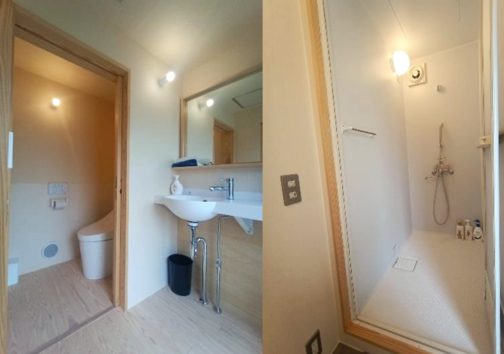 特徴④アウトドア初心者でも安心な高規格設備!客室内シャワールーム・トイレと 全天候型食事スペース