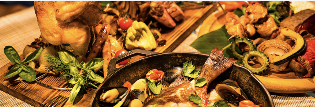 直島産にじいろサーモンのスモーク・岡山県産マッシュルームと浅利のアヒージョ/地元野菜をふんだんに使った焼き野菜/KUJIRA-JIMAオリジナルピザ/国産厚切りステーキ・岡山県産千屋牛カルビ・プロッシェンソーセージ/あわび・エビ・旬の鮮魚やBBQなどたくさんのメニューが用意されています。