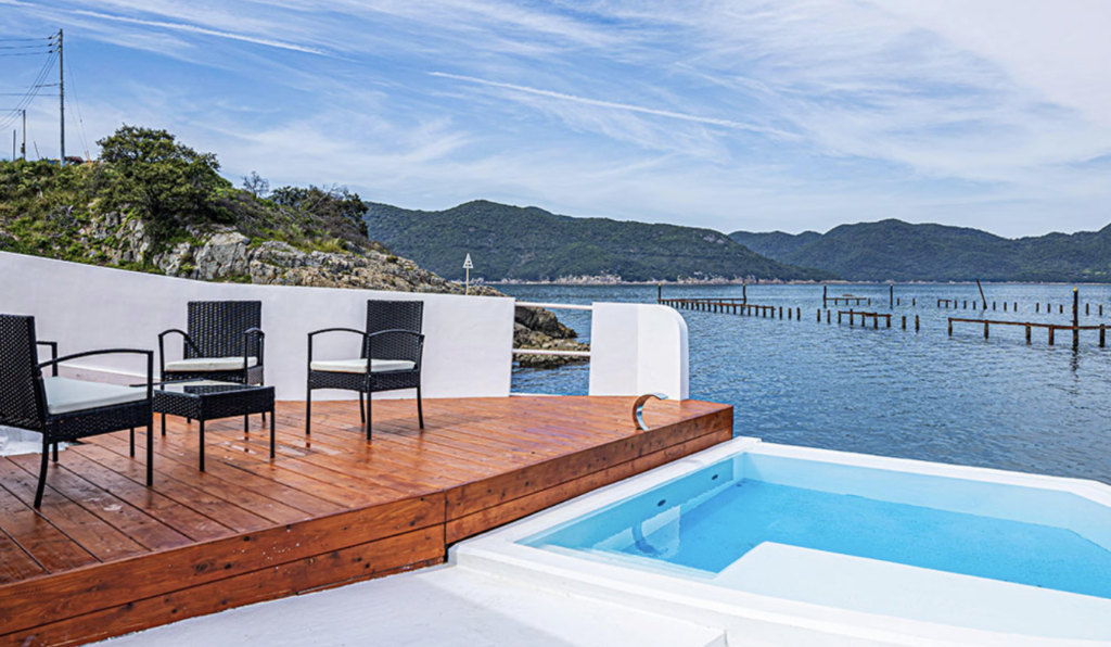 ありのままの自然と美しい海が残る日生諸島、頭島にギリシャ、サントリーニ島をモチーフとしたグランピング施設がオープン。全棟オーシャンビュー、白と青のコントラストが織りなす極上の景色!サンセットを楽しむプールや、バルコニーから眺める手が届きそうなほどの満点の星空。