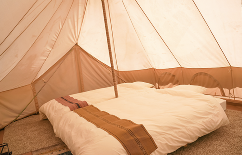 北欧の原住民族が使用していたテントにルーツを持つ、伝統的ベル型グランピングテント。テントの素材に100%コットンキャンバスを使用し、柔らかい風合いと自然素材の心地よさの中、西表島の大自然の中でキャンプをお楽しみ頂けます。