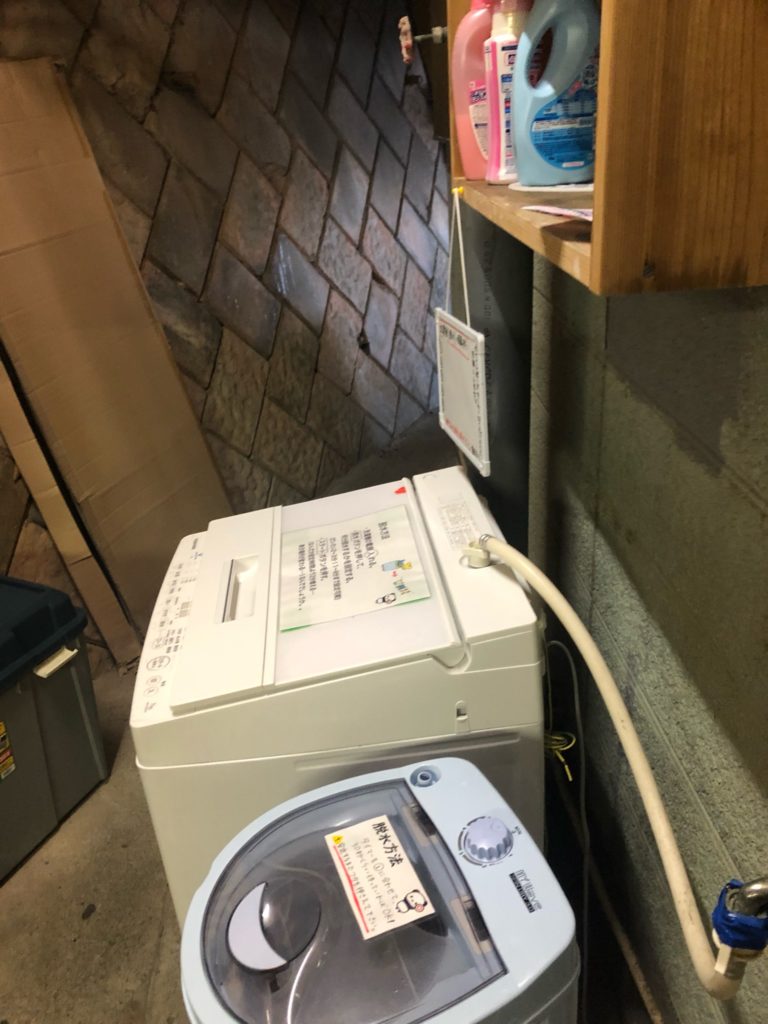 「宿まるい」に宿泊した際に写真を撮ってきました。洗濯機、乾燥機があり、洗剤も使用可能でした。洗濯機は2台あり、先着&予約順です。レンジと冷蔵庫がありました。