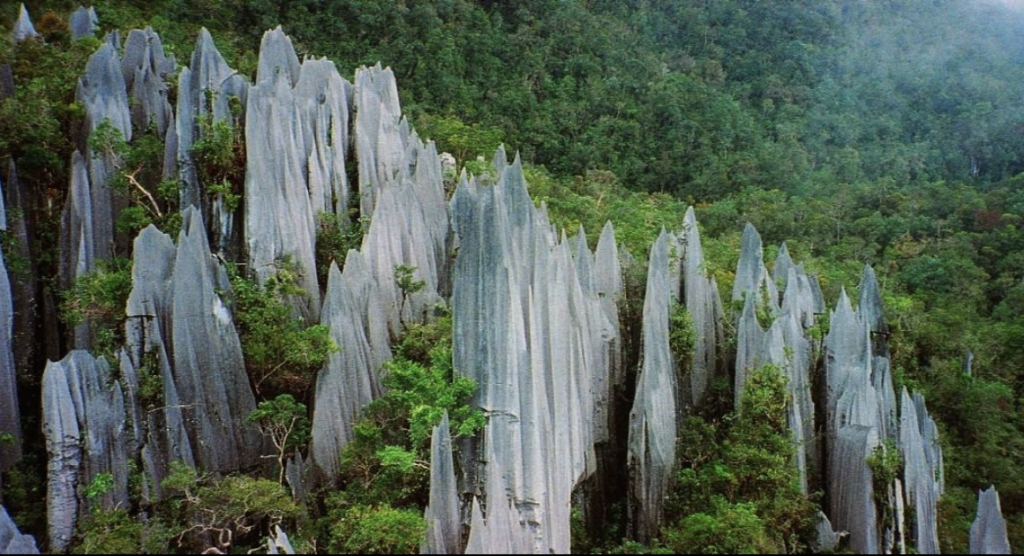 標高2371mのムル山を中心とするボルネオ島北部の熱帯域に位置するカルスト地域です。約3500種の維管束植物が生育し、ヤシは100種類を超えます。81種類の哺乳類、272種類の鳥類など多様な動植物が生育し、総延長295kmにわたる洞窟があり、世界で最も洞窟が多い山と言われています。中でもサラワク洞窟は世界最大と言われ、大量のコウモリが暮らしています。